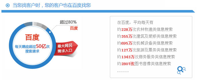百度是全球最大的中文搜索引擎,占据超过80%的中国搜索市场份额,超过5亿中国网民已经习惯了在有需求时“百度一下”!